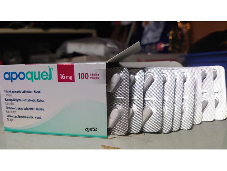 Allergi-medicin Apoquel 16mg tabletter (1 tablet daglig for hund 25-40kg), normalpris for 100stk ca 1840kr., her får du 86stk for 1000 da Marley desværre er død for nylig