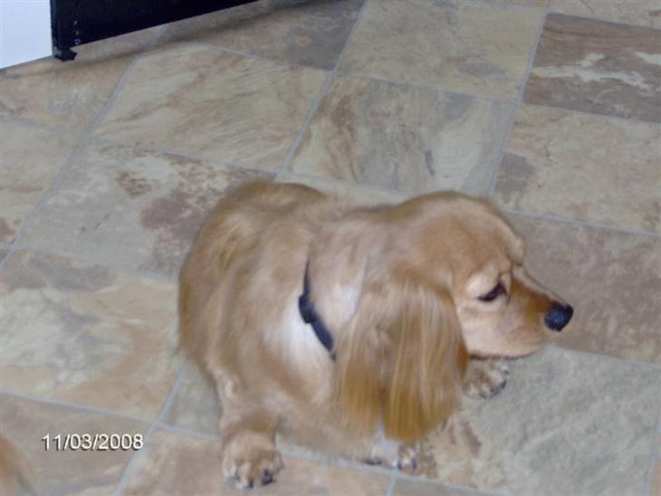 Her er resultatet på min lille hund, da jeg hentede hende i dag - jeg bad om at få hende studset en lille smule ved skuldrene, hjælp til nogle meget genstridige knuder under ørerne og lidt småstudsning så hun blev lidt pænere. Hun er nemlig ved at smide den sidste hvalpepels og så derfor temmelig vild ud - men nu? Hun er næsten halveret.