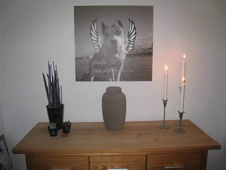 Vores dejlige Dollar har fået en fin plads i vores nye hjem, Han skal først graves ned til sommer når vores have er helt færdig. indtil da står hans urne her... Vi savner ham...