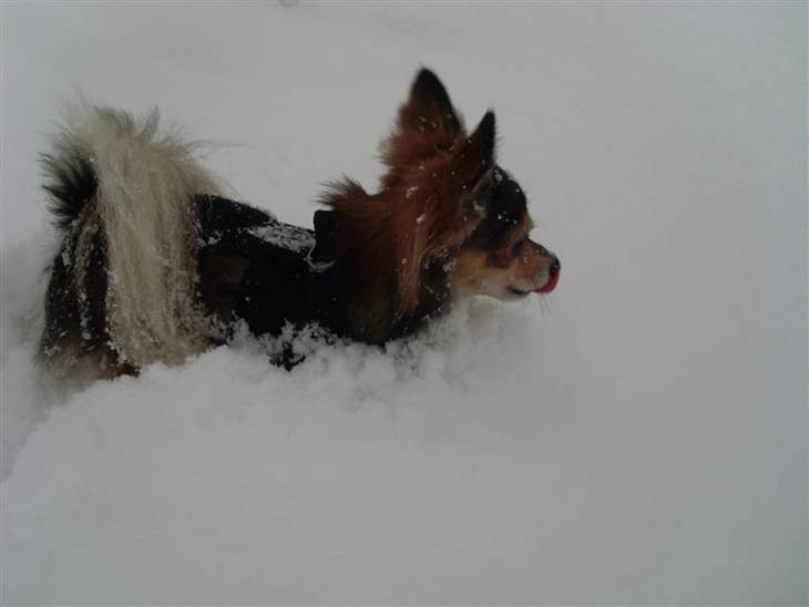 Cody kan ikk ha sele eller noget på, for sneen samler sig der.