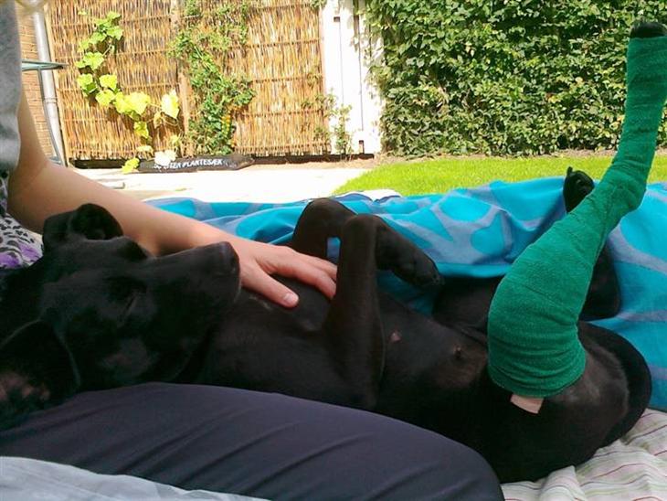 Torsdag: Selve oprationen har været vellykket, der var ingen komplikationer. Da jeg fik hende hjem var hun meget fortumlet og skulle gerne have mig tæt på hele tiden, med min fulde opmærksomhed. Har smidt en madras på gulvet i stuen, så der skal jeg sove de næste par nætter. På selve oprationsdagen bevægede hun sig stort set ikke, men i nat klokke halv 2(natten til fredag) havde hun rejst sig og stod ude ved hoveddøren og peb. Så det var på med tøjet og ud og lufte gangbesværede hund midt om natten, hun gik selv ud af døren, men jeg bar hende hen til en god græsplæne(hun er heldigvis ikke alt for stor). Hun må kun få "gåture" a min 5 her i starten, hun gik og snusede lidt og tissede en kæmpe tisse tår. Er spændt på hvordan hun klare en nummer 2, eftersom hun ikke støtter på benet.
