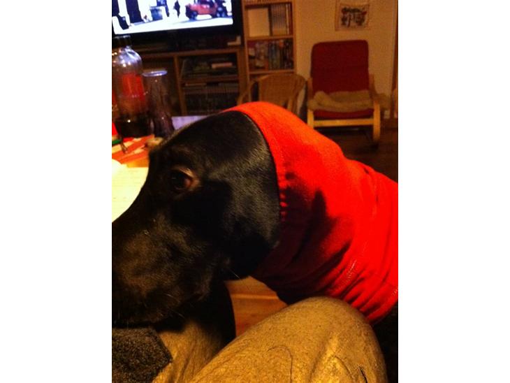 Da Dino har hul på sin øreflip, som hele tiden går op og bløder når han ryster på hovedet, har jeg fremtryllet dette halsrør for at prøve at beskytte ørerne så de ikke flagre sådan rundt når han ryster med hovedet.