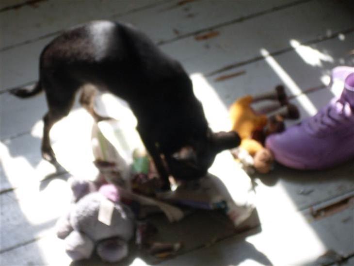 Koda er i dag d. 1maj 2011 6 mdr. og 14 dage...han er renlig men syntes åbenbart at den der avis der lå i avis/blad kurven lige skulle have en tur. han har det med at "sjæle" alt på sin vej som han kan slæbe sko,tasker og tøj for så at samle det i en bestemt bunke eller i en af hans kurve. så mangler man noget skal man kigge i "ravnen's redde" aka koda's kurv:)