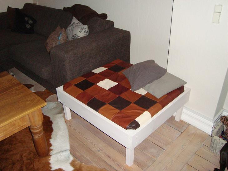 Inde i stuen har jeg lavet en kurv med en træramme, lameller i bunden ligesom en alm. seng også skåret en billig skummadras over så den passer i rammen. Også er den blevet betrukket med læder men man kan også nemt selv betrække det med et tæppe, eller sy en dyne ind i et betræk der passer :) Hundene er helt vilde med at ligge i den, MEN efter vi har fået den trappe til soveværelset så vil jeg ha skåret noget af benene så den bliver en form for trappe samtidig med at det er en lækker pæn kurv at have i sin stue :) Plus at hunden ikke får træk da den er over gulvniveau...