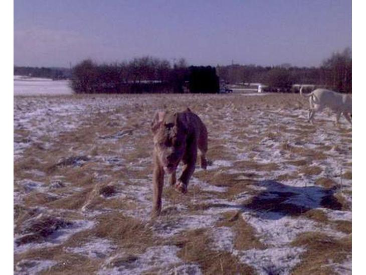 jeg er sølv-sandfarvet med hvidt bryst og hvidt på alle fire poter og jeg er født uden hale. den største charme ved mig er nok at jeg har 1½ cm underbid og at jeg savler når det falder mest ulejligt.desuden er jeg dogoerne fang og esto´s legekammerat vi bor nemlig sammen
