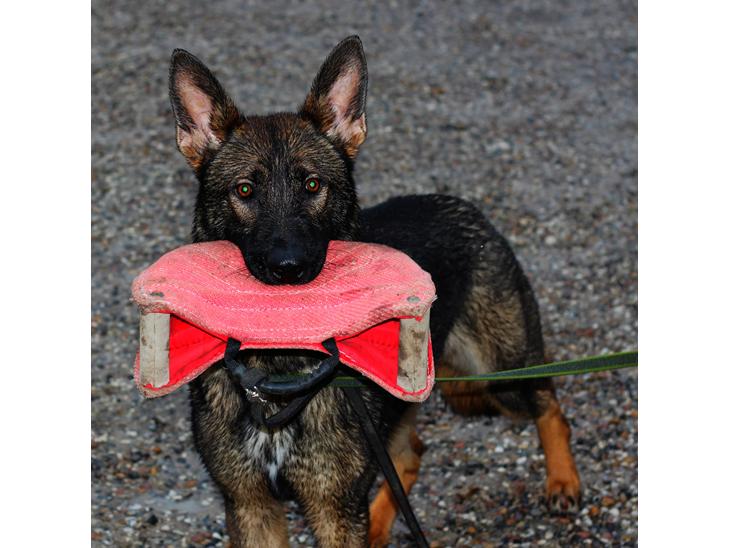 Kan bide i bidestyr, sit, dæk og plads. Er begyndt på apport. Går rigtig gode spor.
