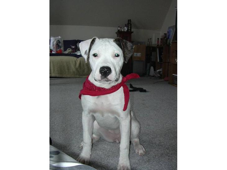 En lille hvid tæve på pt 27kg. Kun har en lille bitte sort plet på det ene bag ben. Ellers er hun hvid med sort næse, et tiger stribet øre og en lille smugle sort på der andet øre og eye liner i begge øjne.