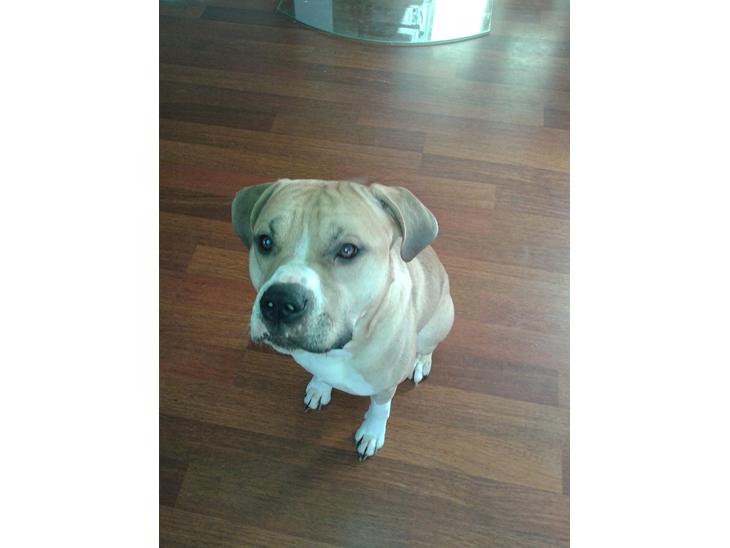 Buthler er en blanding af dogue de bordeaux, boxer og mastiff han er ca 50cm og vejre ca 34kg