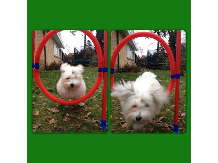 Lydighed: Sit, dæk, rul rundt, high five, danse, buk, rundt, op (rejs dig), bliv, kom, på plads.