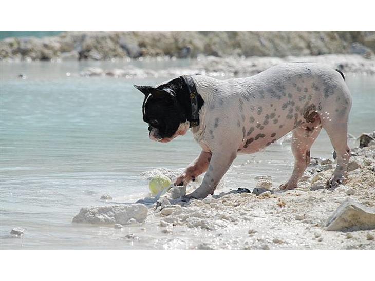 Han er vild med vand og går med i bad lige så ofte han kan komme afsted med det. Pludselig sidder der sådan en lille pølse nede mellem ens fødder ude i badet:-) Nu ikke lille men stor pølse..