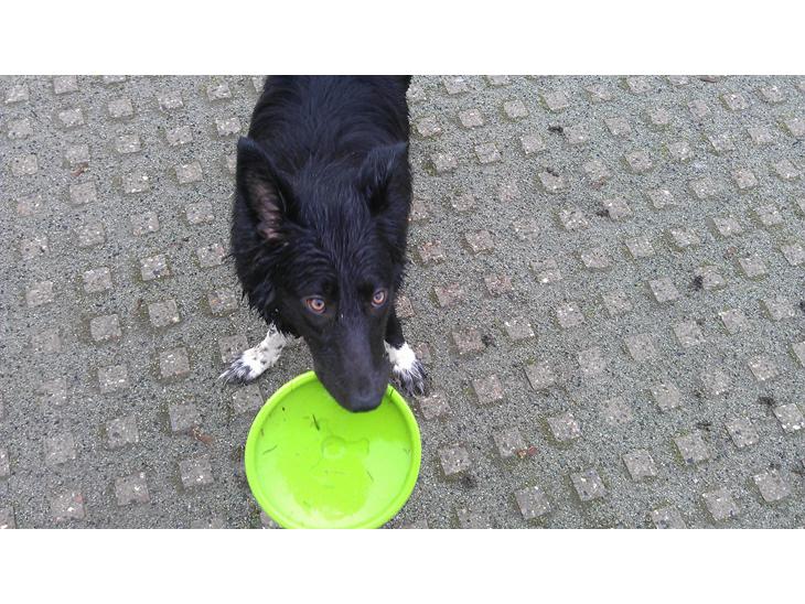 en lille Border Collie og hun er sorte og hvid og lite røde ved øren