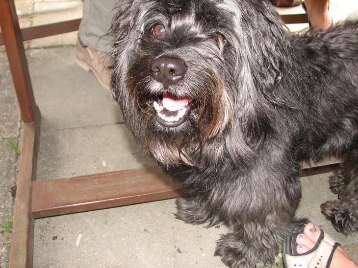 Han er sort med pæne slangekrøller, halv pudel, halv pomenran.