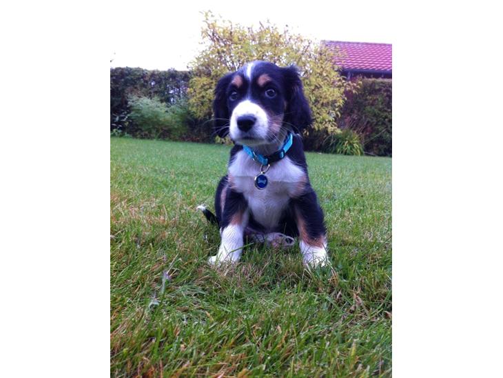 Blanding af Islandsk fårehund (far) og Cocker spanier (mor) - (der er billeder af dem i Cody´s galleri), han er født 4 august..