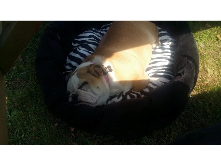 freja er em stille og rolig hund meget rolig af sind hun er faktisk ret livlig af en engelsk bulldog at være vi går tit lange ture i skoven og hvis hun bliver træt kravler hun bare ind under barnevognen og bliver kørt hjem. hun elsker min søn og de er vildt søde sammen kan hun komme til det sover hun ved siden af tremmesengen :)