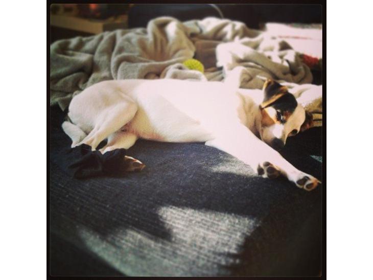 Han sover helst i sengen, og bliver han forvist til 'kurven' eller tæppet på gulvet, hopper han pænt ned og bliver der resten af natten (for det meste) :-)