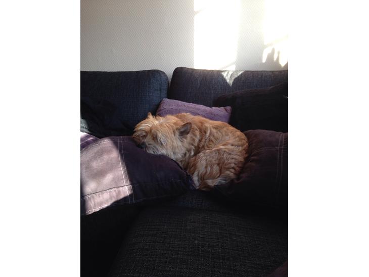 Meget egenrådig nem at fornærme og. Bare helt sin egen. Elsker at sidde i sit vindue og holde øje med haven, og skælder ud hvis en kat, solsort eller andre dyr passere den. Har sin egen kattelem, som han kan gå ud af, men ikke ind. Kan så absolut ik lide andre hanhunde, og slet ikke gule hunde. Sød og sjov hund.