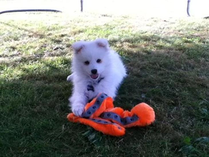 Kenzo kan sit, dæk, give pote, high five, vinke, kurv, bliv, halse(gø på komando) og på plads. Han er ved at lære at rulle rundt.
