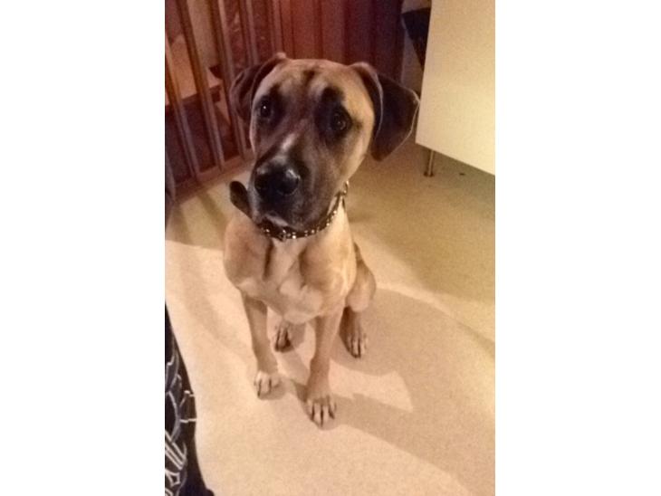 Stor hund, når han står på bagben, er han på højde med mig (160 cm). Han kan ikke selv forstå, at han ikke er så lille, når vi leger