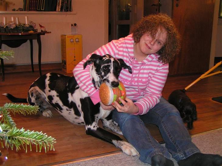 Trixi er en grand danoirs, men da hun er tvekønnet er hun fejludviklet, og mangler derfor størrelse og robusthed. hun er super smuk, ikke mindst hendes øjne!