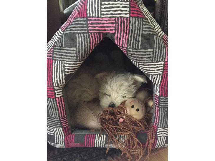 Lille glad tillidsfuld hvalp. Helt hvid med sort næse og øjne