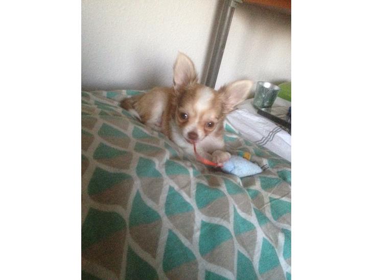 Golden hentede jeg dagen after han blev 8 uger , min anden chi manglede en kammerat og jeg faldt pladask for lille manden her ... Han er en glad og meget venlig hund , men også en fryse pind :) han kan med alt og alle om det er dyr eller mennesker , simpelthen bare så glad for ham :)