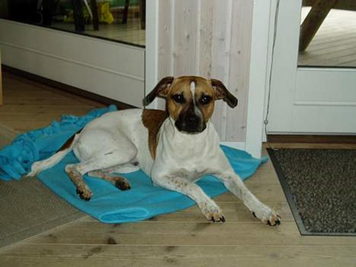 han er hvid med brune pletter, og er meget spættet på ben og på maven. han har en hvis plis i panden. og de sødeste brune hundeøjne. han vejer omkring 13 kg.. Han er en meget nervøs hund, som meget let bliver bange, men det gør også at når du siger nej så forstår han det med det samme, så det er en fornøjelse.. Selvfølgelig har han en lille fejl, han bliver somrgel så glad for at se folk, at han tisser på gulvet, hvad kan man evt gøre ved det er der nogen der har nogen gode råd???