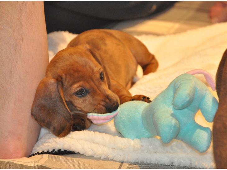 Modig lille tøs, der gerne tumler med vores anden gravhund Sui, deler tyggeben og sover i ske :)