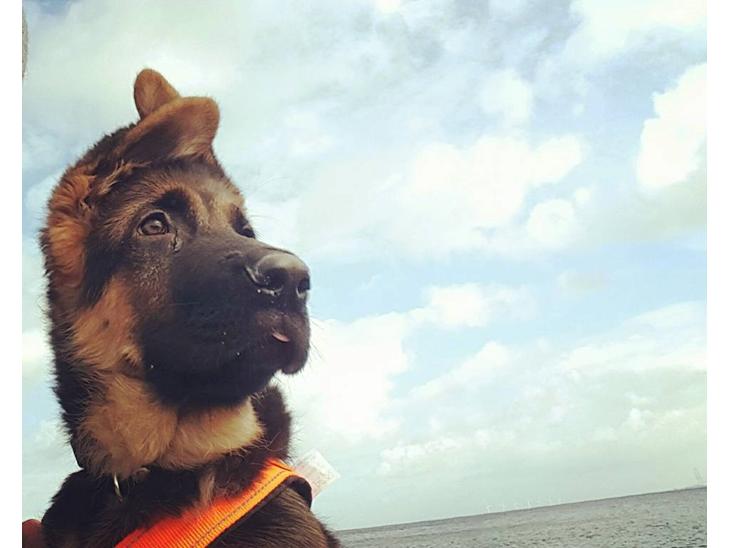 Sort/brun Schæfer med store brede ben og poter, Ører er næsten rejst utrolig lang hale der når jorden når han går :-)