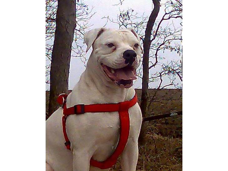 Bulli type, muskulløs, hvid med to små pletter under øjne.