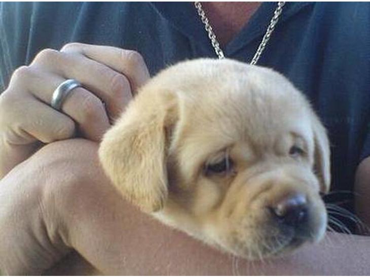 Vi faldt for ham da han har en lidt mørkere pels end den lyse man normalt ser hos labrador.