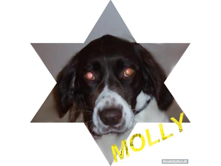 Molly er hvid med brune aftegn og hun har nogle dejlige søde øjne.