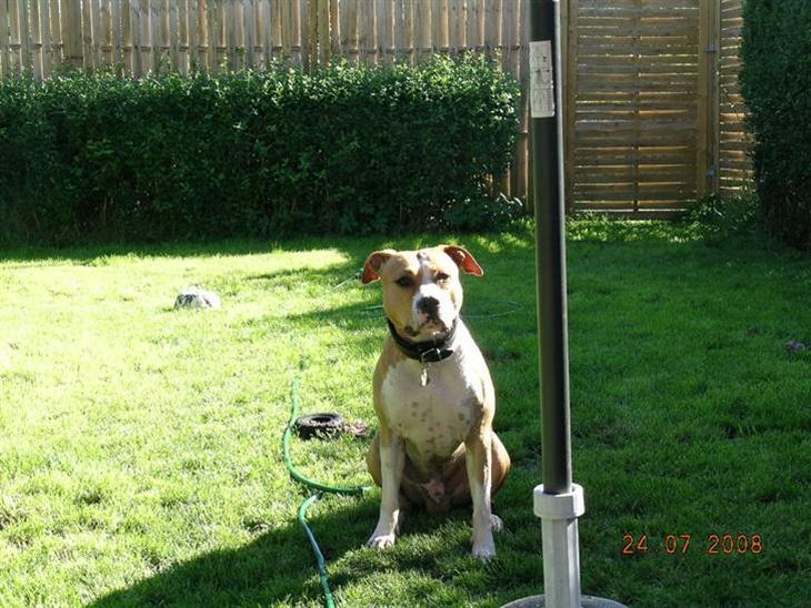 Han er en rød Amstaff med hvide aftegninger. masser at gåpåmod, en stor stolthed og masser af energi.