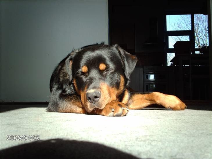 Han er en stor og rigtig glad hund..Han fjoller rundt, både alene eller med vores katte. Da vores killingers mor døde, blev han deres papmor.. Det er et dejligt syn.. =0)