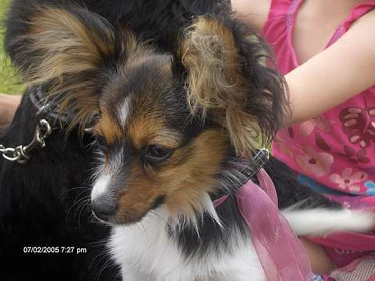 Sille er en blanding mellem papillon/chihuahua.Hun er sort,hvid og brun.Hun er længhåret.Hun har kæmpe ører