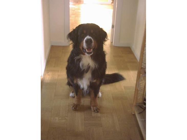 stor bamset han hund. sort på det meste a kroppen, hvide pote, brune ben, hvid og brun snude og så sæfø'li' sort næse... så er han da oss verdens bedste hund....!!