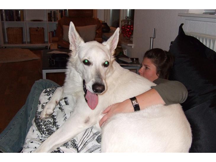 Smuk hvid hund, med masser af charme, når det passer hende. Hun tror selv at hun er skødehund, på trods sine 35 kg... Hun elsker at lege med kattene, men engang i mellem må vi dog skride ind, men det er typisk fordi hun piver... Kattene skal nok klare sig :-)