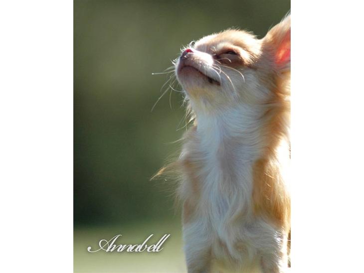 Annabell AKA. frøken evigglad, har det kæreste temperament man kan ønske sig. Hun er altid glad og den lille hale logrer konstant, eller er højt båret over ryggen =o)