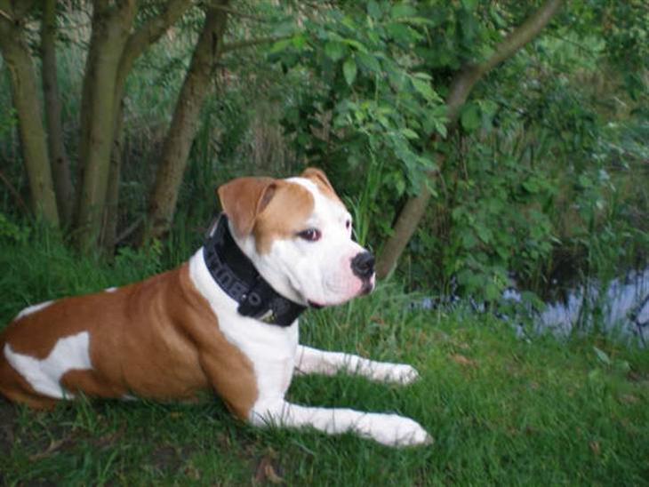han er ½ amerikansk bulldog og ½ amerikansk stafford shire terrier, faren er stafford og moren er bulldog. faren vejer omkring 24 kilo og moren er en ordenlig en på omkring 52 kilo.