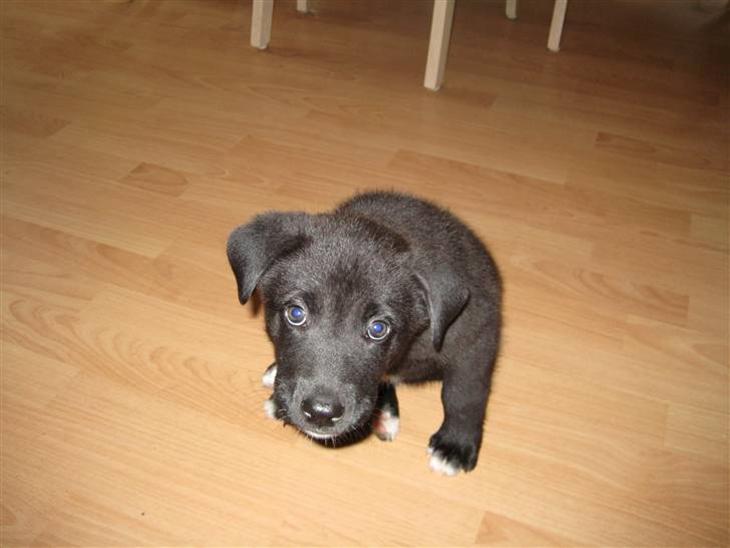 Hun er en lille krudtkugle med sort kort hår, hvid blis på brystet og hvide "tipper" på alle 4 poter. Kandis far er samojed så vi er spændte på om hun har "arvet" hans pels, eller om hun får sin mors kortere labradorpels...