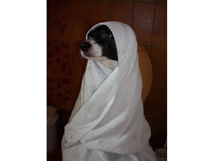 Det første billede hvor hun sidder i håndklædet er bare så sødt. Min gårdhund Baloo på 4 år, bliver også pakket ind når han har været i bad, så sidder han og venter på at blive føntørret. Han er også her på HG, så du er velkommen til at smutte forbi og se ham.