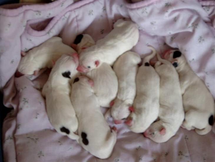 Så er det endelig overstået. 3 hanner og 6 tæver. De er rigtig søde og kønne. Første hvalp født kl 15:10 lørdag den 22/9 og sidste hvalp kl 12:30. Alt gik godt og de vejer mellem 250g og 450g, så der er noget forskel på dem. Der er en der er helt hvid og ellers har de sorte, sortbrune eller brune pletter. Meget rolige og søde.