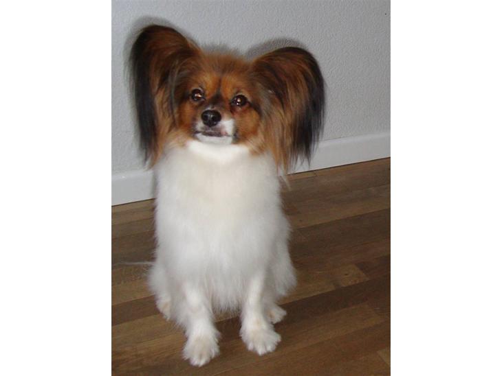 Dolly er en meget dejlig og blød hund! Hun er tricolour. Kroppen er mest hvid med en sort plet oven på ryggen. Hun har et smukt brunt /sort og hvidt ansigt.