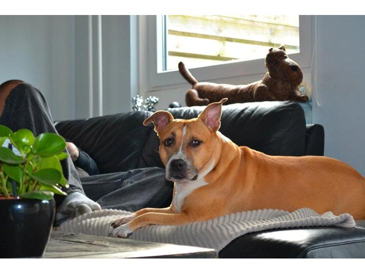 Er en rigtig glad og dejlig hund, som for det meste finder sig i det meste,