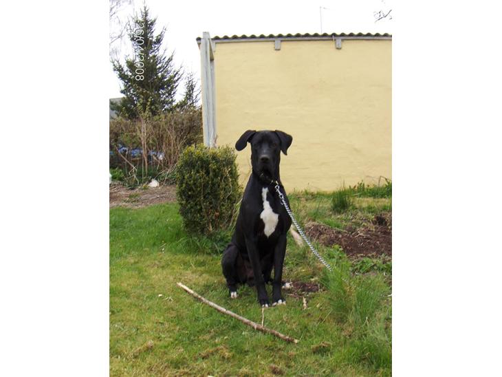 En dejlig sort hund med hvide aftegninger. Holger er en grand danois med et lille stænk af rottweiler i blodet. Han er super flot og bare SÅ dejlig! Han elsker at lege og at nusse.Og så er han bange for vores marsvin og vindmøller. Hans yndlings legetøj er julegaven, som var en KONG. Den bliver slæbt rundt mere eller mindre konstant. Se evt. mit profilbillede hvor han sover med den i munden, så det nærmest minder om han bruger sut. :-D