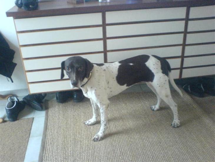 Hun er i rigtig god form, fordi at hun er jagthund, så hun er tynd.