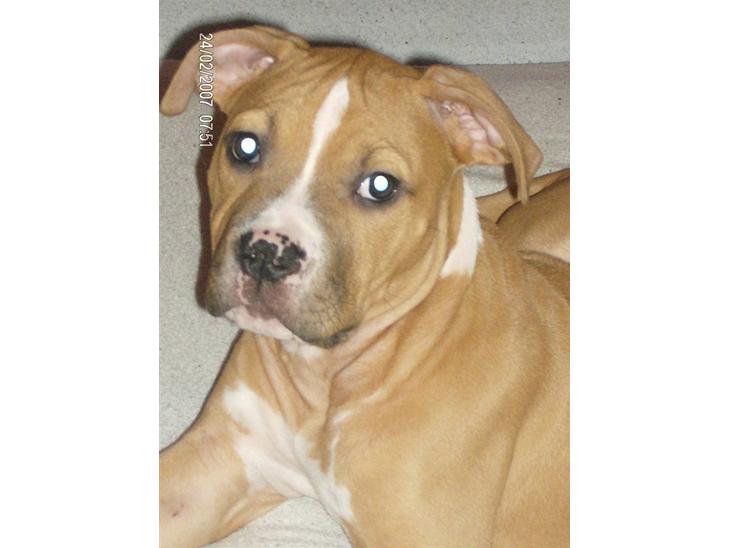 Han er amstaff og amrikansk bulldog.. Han er en hund med krut i numsen, kan ikk sidde stille mere end 5 min. af gangen. Han glemmer at han er en stor hund så når han kommer og vil lig ved en så flyt dig eller han ligger sig på dig. Han elsker at lege med alle. Han passer meget på hans søster hun er kun hans, når vi er ude og gå tur og han går foran så kigger han hvert sek om hun stadig er der. Men far er den bedste i verden.