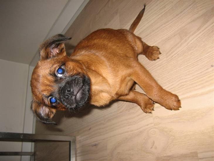 han er lille og brun med sort omkring snuden, og han vil gerne have opmærksomhed. han er en lille hyggetrold. :o)
