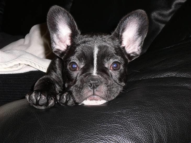 En lille sort brindle Fransk Bullbasse, som for det meste leger konges efterfølger.... hvis hun ikke er i hælene, ja så ligger hun oven på vores fødder :O) Hun hyggepruter MEGET, og det lugter ikke ligefrem godt... puhhh!