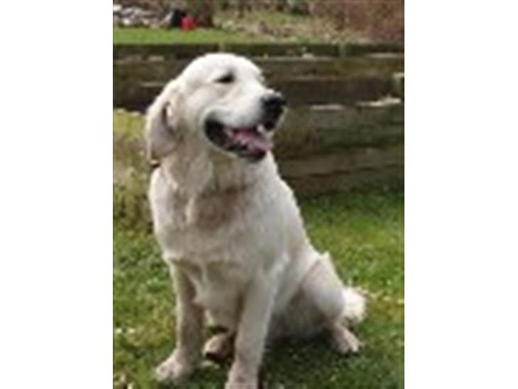 Stor dejlig golden, rolig, legesyg, stædig, glad i begge ender, elsker alle og tror verden er til for ham.