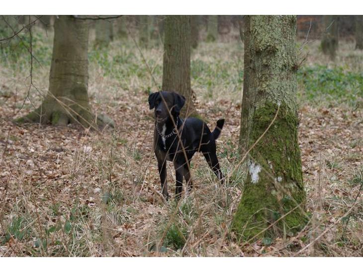 En dejlig glad hund, han kan være lidt frisk. Ser han et rådyr ude i skoven er han pist væk efter det..:-) Det bedste han ved er en tur i skoven.